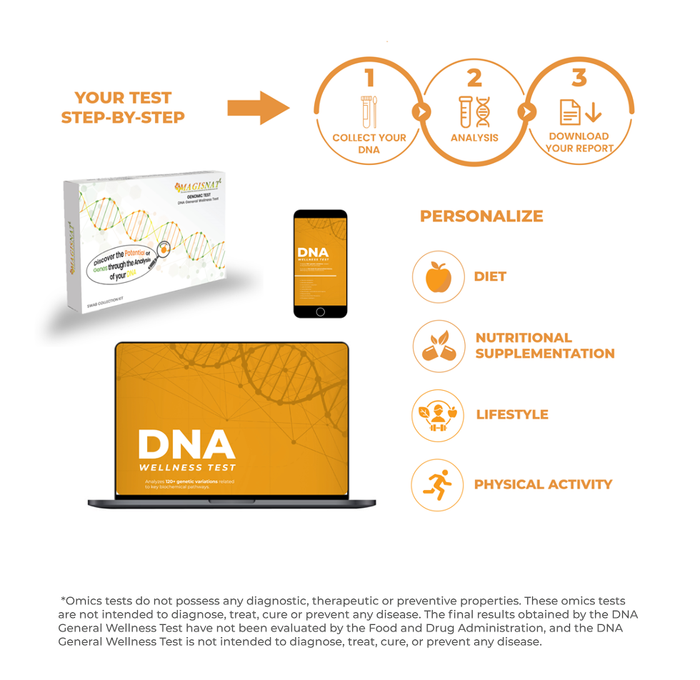 The DNA Wellness Test identifies key biochemical pathways. It uncovers your unique susceptibilities and needs through a simple genomics test. This test provides the basis for MAGISNAT’s tailored approach. By combining omics sciences with precisely formulated dietary supplements, we address the areas where you may be more vulnerable or could benefit from extra support.