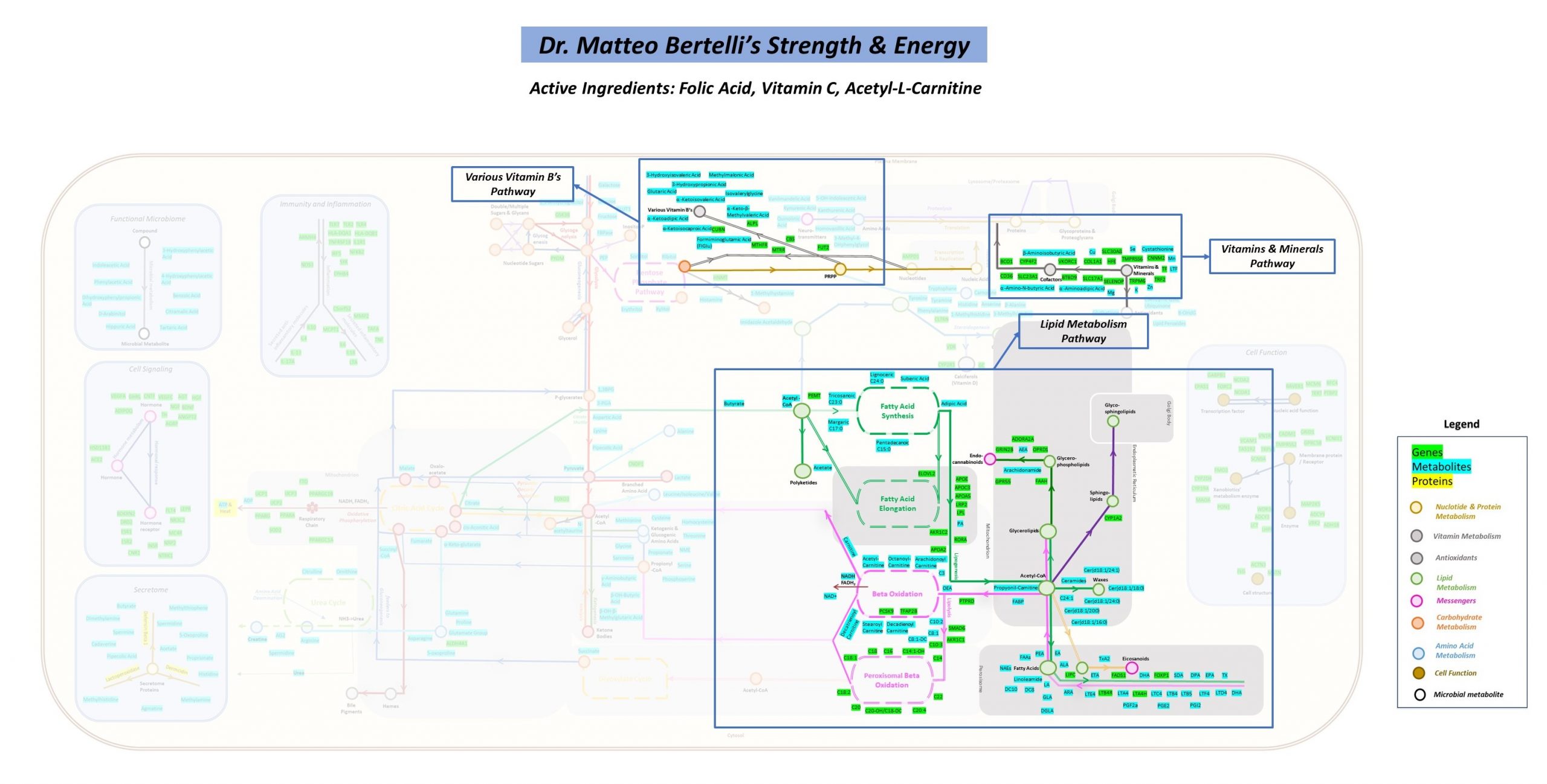 Dr. Matteo Bertelli’s Strength and Energy is a dietary supplement formulated to revitalize the body’s energy level. Acetyl-L-Carnitine supports cellular energy production, aiding in the conversion of fats into energy and promoting metabolic function. Folic Acid complements this process by activating fatty acid metabolism, ensuring efficient energy utilization throughout the body. Vitamin C combats oxidative stress, protecting cells from damage. The synergistic effects of the selected ingredients support a healthy lifestyle. *